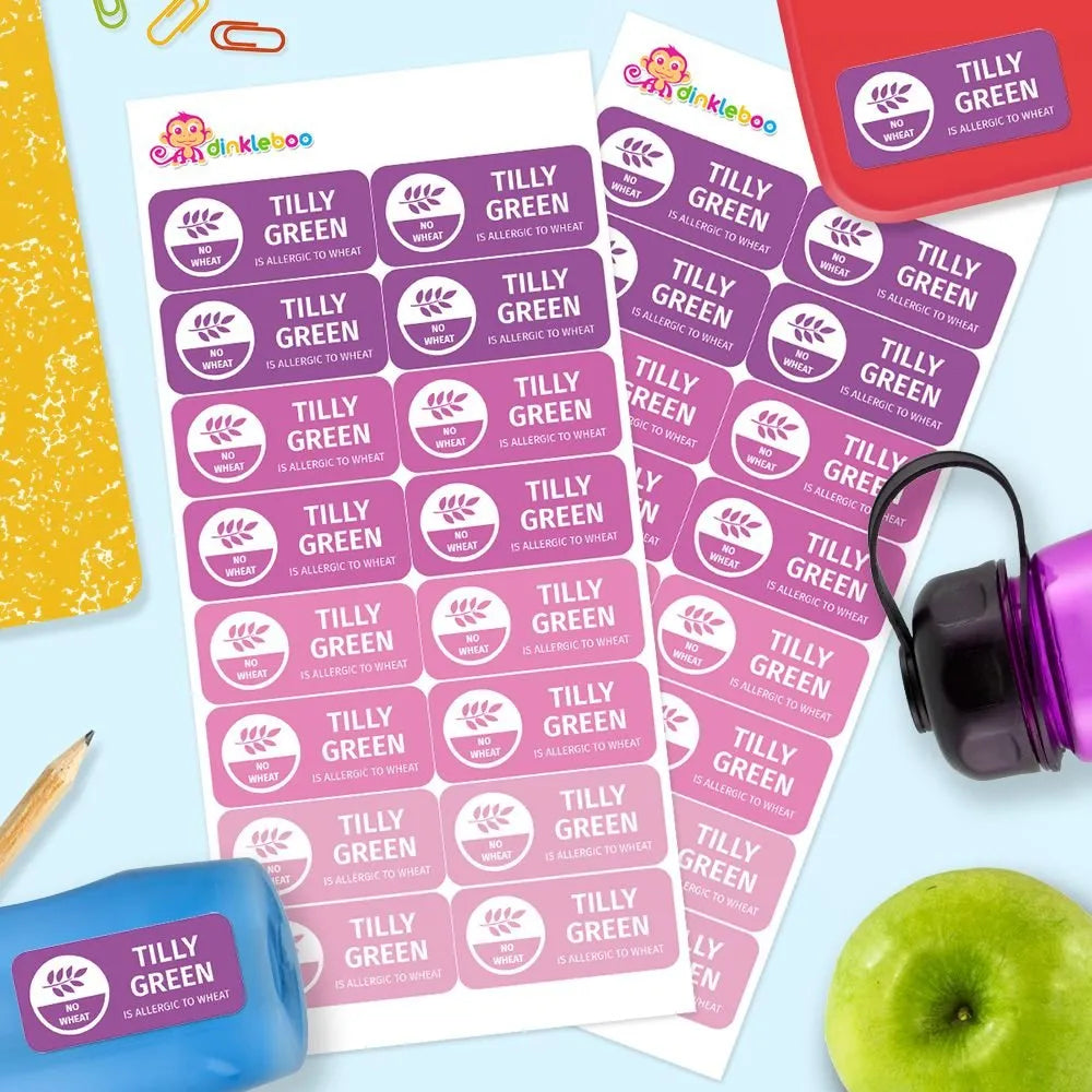 Keep your child safe with personalised allergy name labels — bright, clear, and easy to spot on lunch boxes, drink bottles, and more!