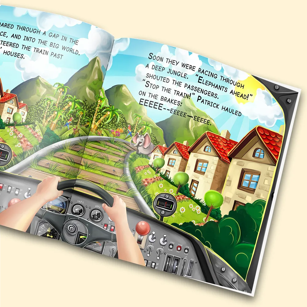 A story about your son or daughter going on an adventure in a magic train. The train encounters a few problems along the way; how will they resolve these issues?